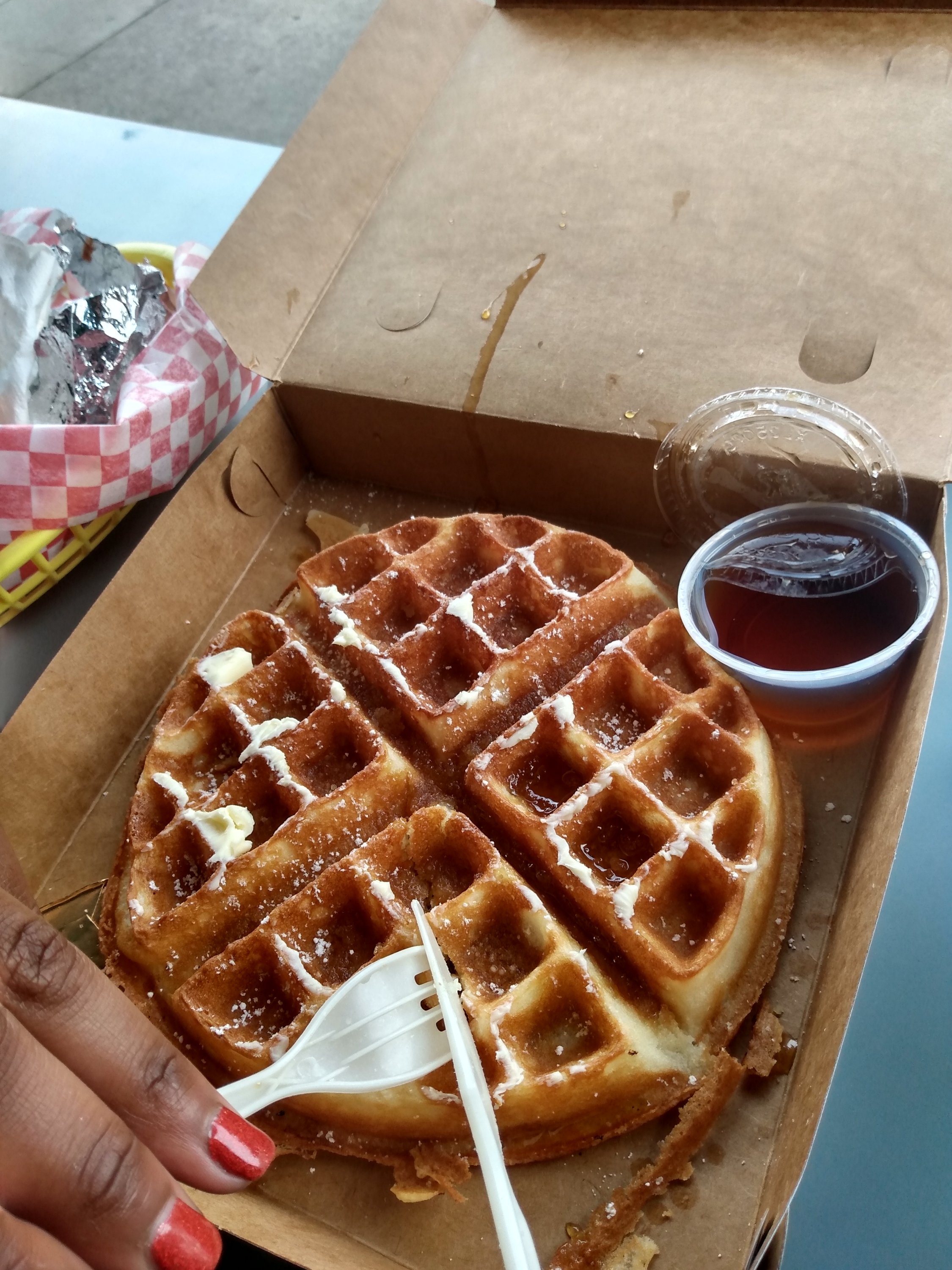 Yumm time @orbitcoffeeanddoughnuts delicious veggie burrito and honey , suger waffle, and a cup of water.