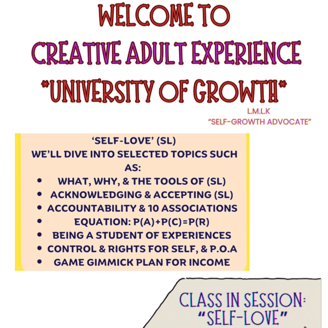 A self-love interactive pad for journaling and self reflection amongst self and any experiences of self growth. Reference to information and where it came from can be found in the book ‘Creative Adult Experience University Self-Growth ‘ by LMLK
